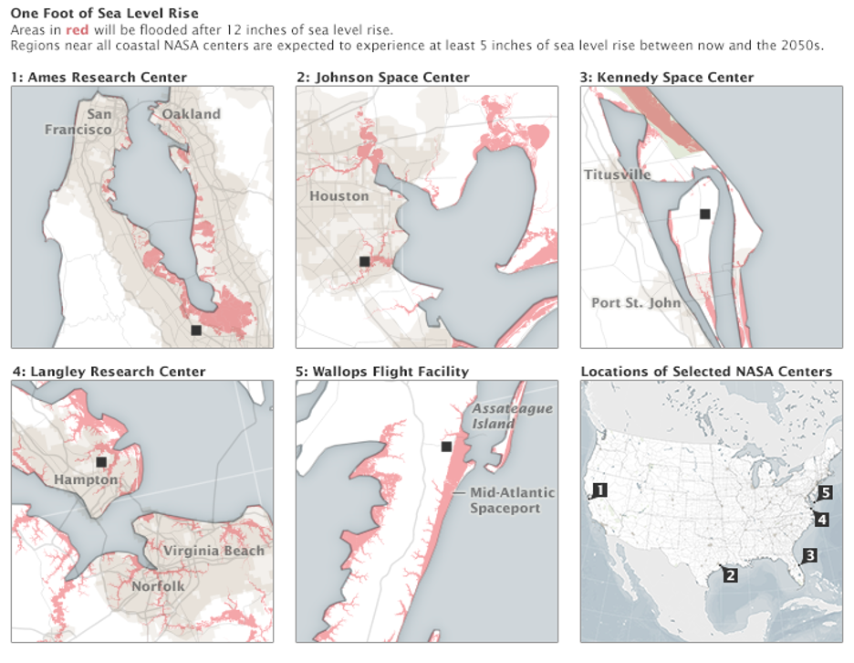 Many of NASA’s historic launch pads, airfields, and research and testing sites can be found close to coastlines across the nation. And the threat to them is increasing. Rising sea levels are expected to make coastal flooding due to both storms and periodic flooding worse and more frequent, in the decades ahead. Storms also could become stronger. Recent studies have shown that the land around five NASA centers – Ames Research Center in the San Francisco Bay area, Johnson Space Center near Houston’s coast, Kennedy Space Center on Florida’s east coast, Langley Research Center near Norfolk, Va., and Wallops Flight Facility on Virginia’s Eastern Shore – could be subject to exacerbated inundation by 2050 due to varying degrees of sea level rise from 12 to 18 inches (30-46 centimeters) reflecting a "High" scenario.