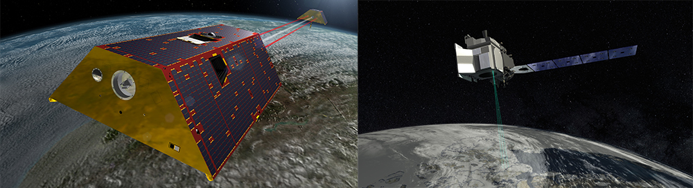 Artist's concepts of the GRACE-FO and ICESat-2 satellite missions. Credit: NASA (left), NASA's Goddard Space Flight Center (right)