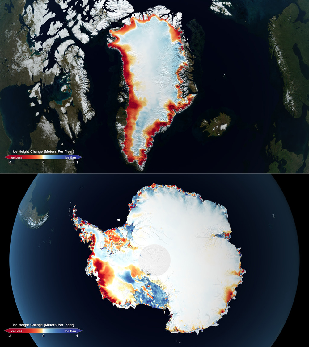 Visualizations of the Greenland (top) and Antarctic ice sheets (bottom). Credit: NASA's Scientific Visualization Studio